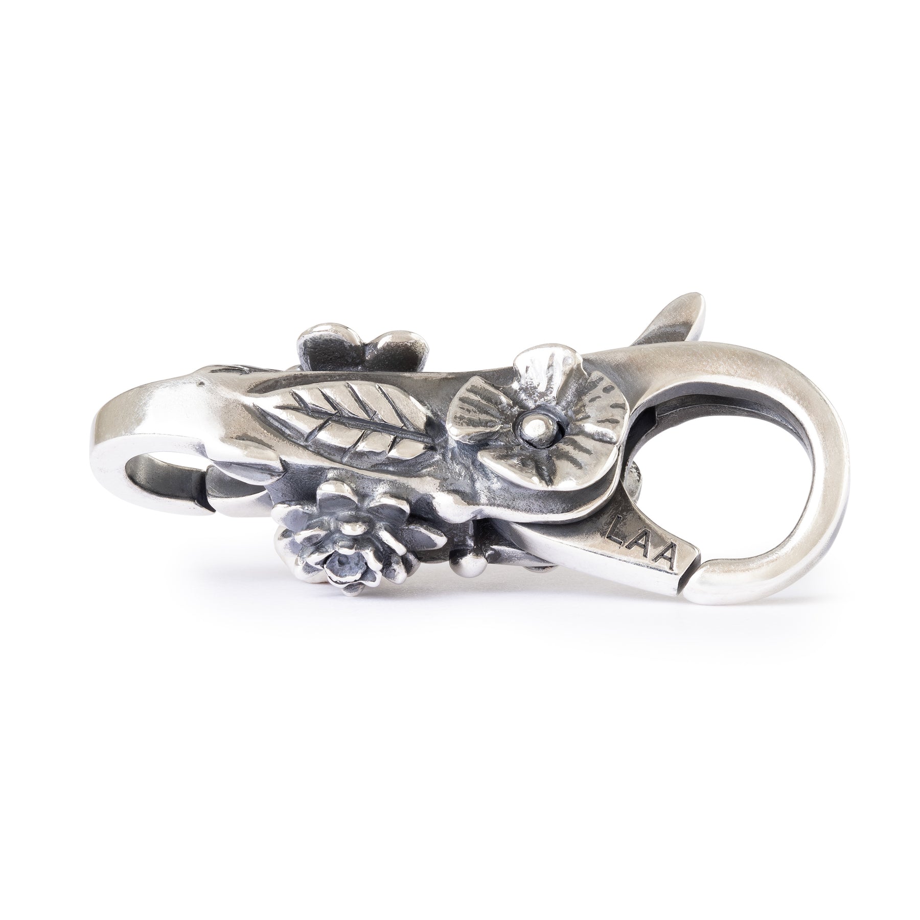 A detailed clasp decorated with blooming flowers and leaves. The design symbolises connection and growth, bringing each story together in one gentle flow.